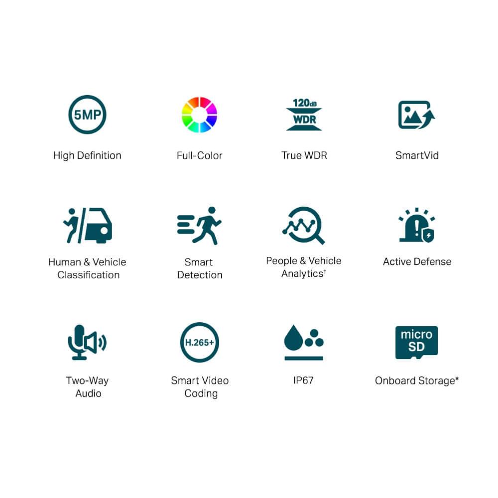 Caméra bullet réseau extérieure IP67 TP-LINK avec capteur fixe 5 mégapixels Full Color, vision jour nuit avec IR jusqu'à 30 m, audio avec micro et haut-parleur intégrés, détection intelligente de mouvements et d'intrusions, classification humain/véhicules.. Distance focale 2,8 mm