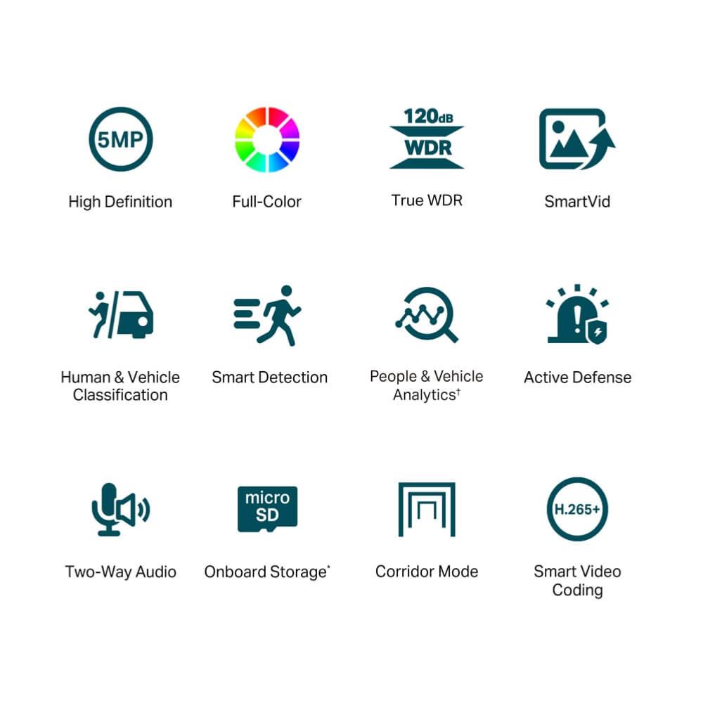 Caméra tourette réseau intérieure TP-LINK avec capteur fixe 5 mégapixels Full Color, vision jour nuit avec IR jusqu'à 30 m, audio avec micro et haut-parleur intégrés, détection intelligente, classification humain/véhicules, mode corridor, défense active. Distance focale 2,8 mm