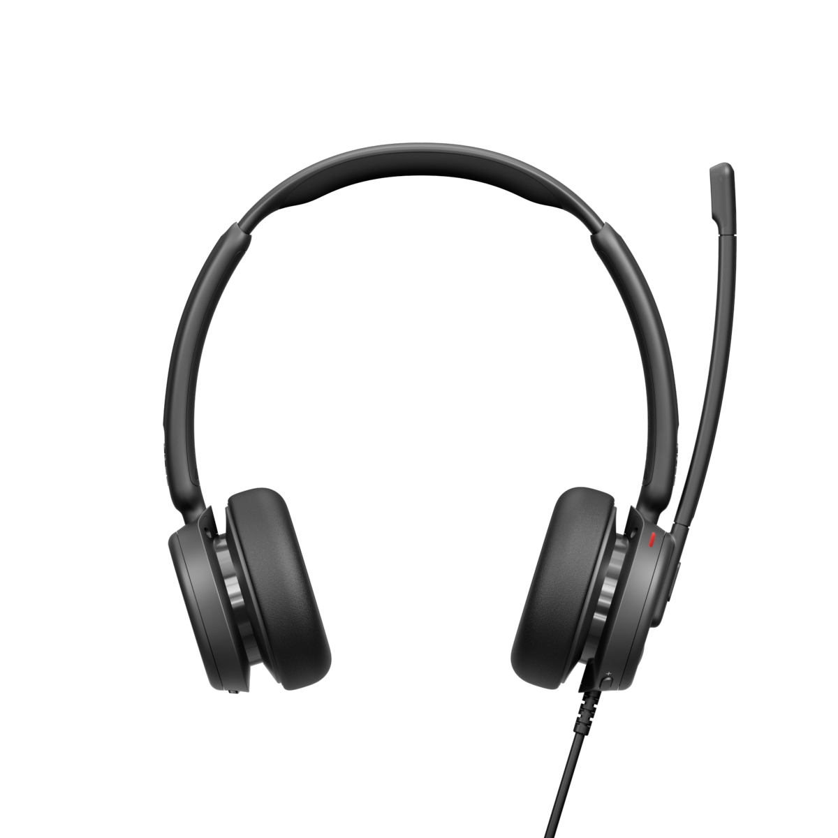 Micro casque filaire moyen de gamme, connectique USB A et C, serre tête rembourré, 2 coussinets en simili cuir, perche relevable, commandes sur le casque, 4 microphones avec captation basée sur l'IA, ANC Hybride. Pour communications unifiées, version certifiée pour Teams.