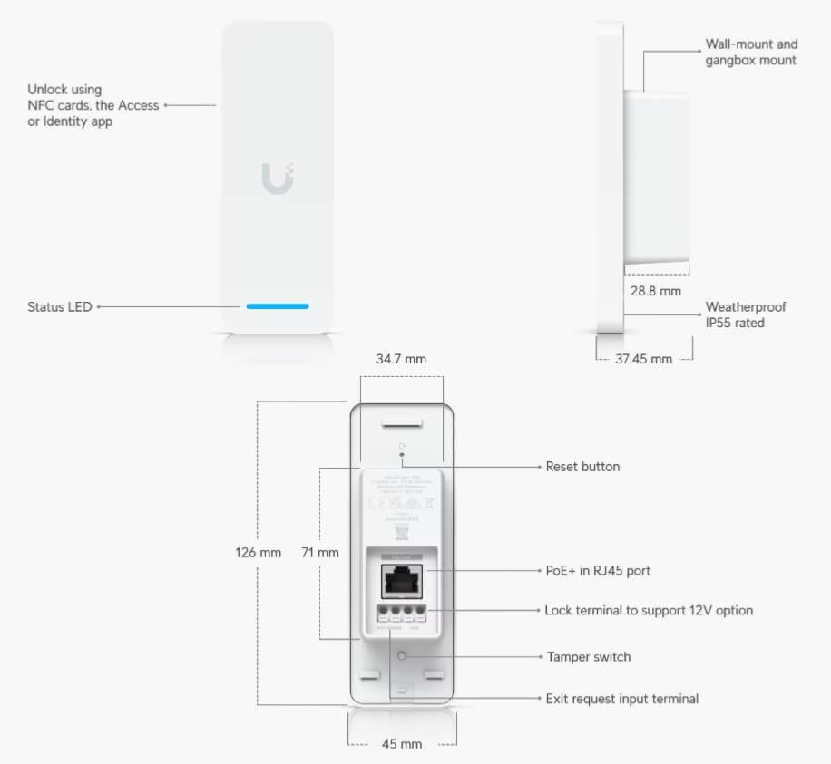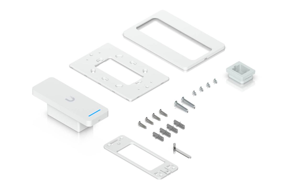 Lecteur de cartes NFC et Bluetooth pour solutions UniFi Access Ubiquiti. Alimentation PoE, montage mural encastré.