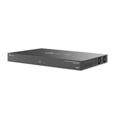 Enregistreur vidéo réseau rackable TP-LINK pour 16 caméras IP avec 3 sorties vidéo ( 2 HDMI 4K, 1 VGA), affichage en direct 16 canaux avec une définition de 8 MP, enregistrement continu 24/24, 2 ports RJ45, 3 ports USB, 1 port série, entrées et sorties d'alarmes. Stockage pour 4 disques durs SATA