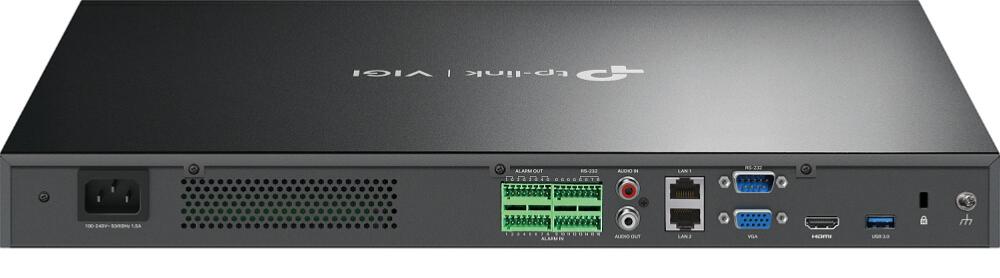 Enregistreur vidéo réseau rackable TP-LINK pour 32 caméras IP avec 2 sorties vidéo HDMI 4K et VGA, affichage en direct 32 canaux avec une définition de 8 MP, enregistrement continu 24/24, 2 ports RJ45, 3 ports USB, 1 port série, entrées et sorties d'alarmes. Stockage pour 4 disques durs SATA