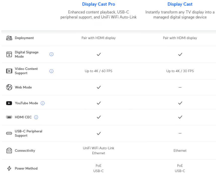 • Fonction : permet de transformer un écran HDMI en un appareil d'affichage numérique géré par UniFi Connect